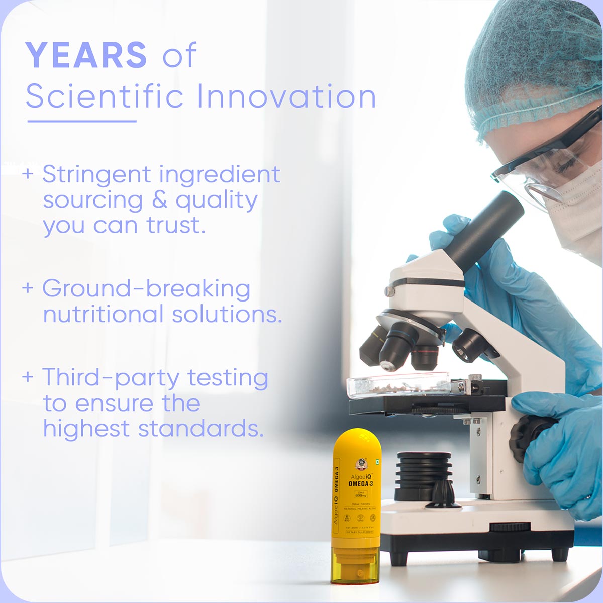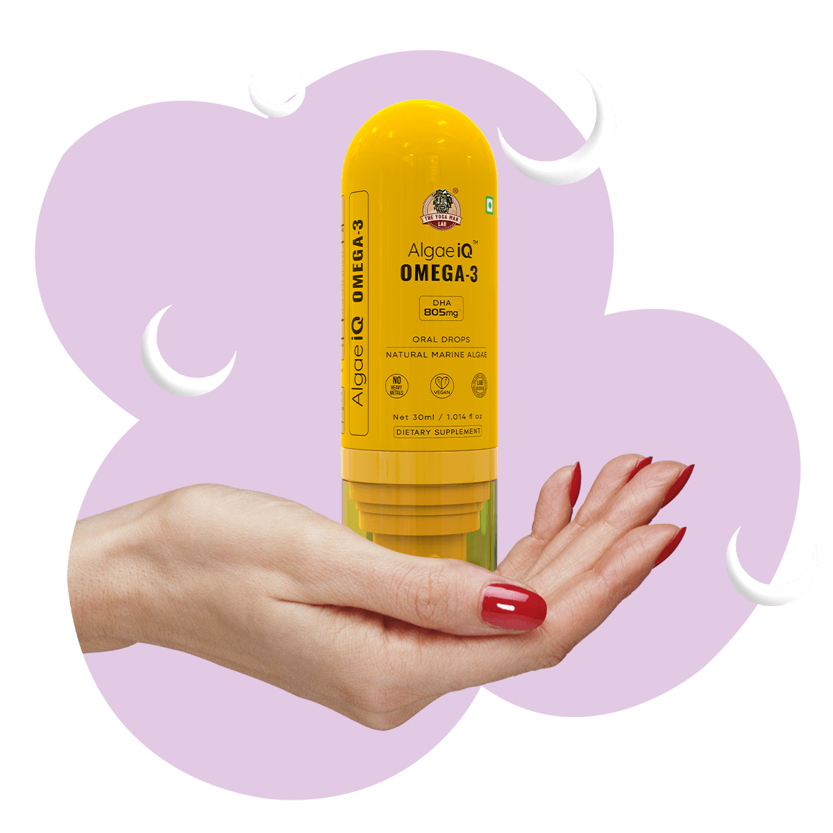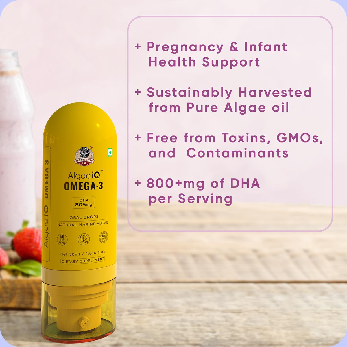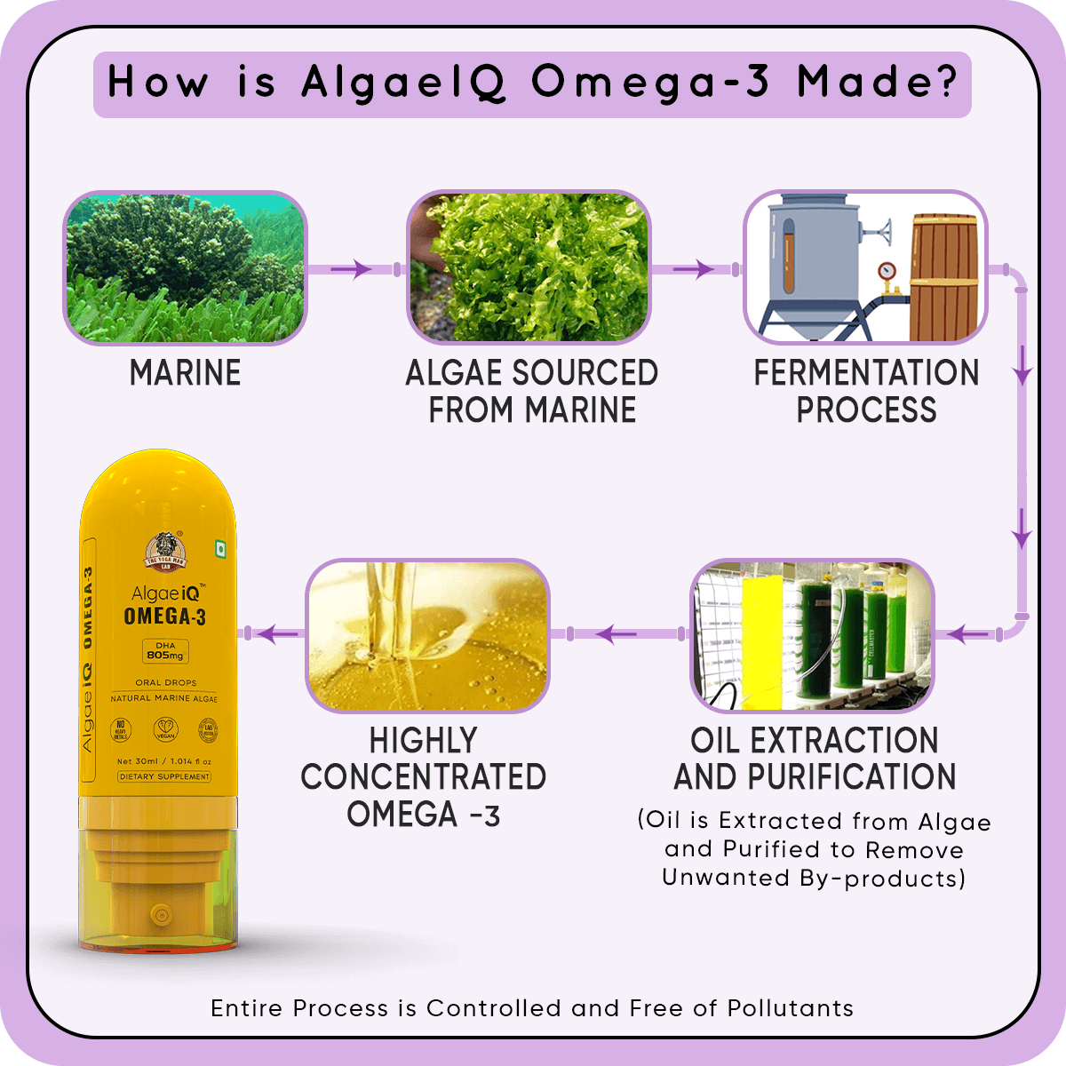 AlgaeIQ oil is derived from marine algae making it free from pollutants like mercury, heavy metals, PCBs, and microplastics, ensuring a pure and safe omega-3 source.