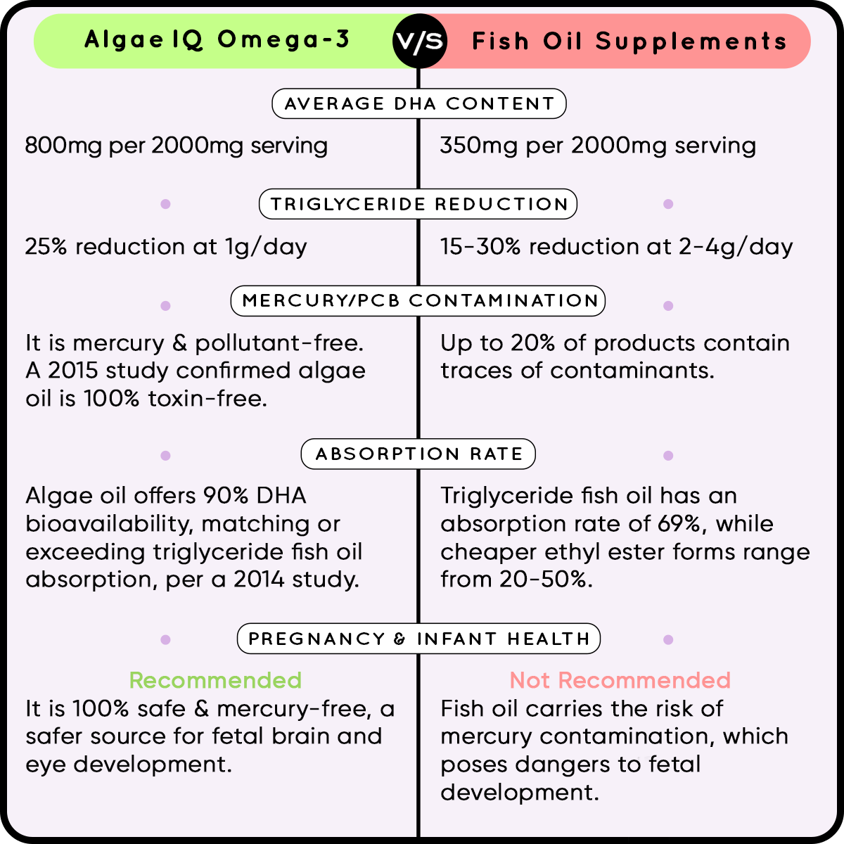 | Risk of contamination From Mercury/PCBs | Up to 20% of products contain traces of contaminants | Free from mercury and other oceanic pollutants. A 2015 study showed that 100% of tested algae oil samples were 100% toxin-free. |